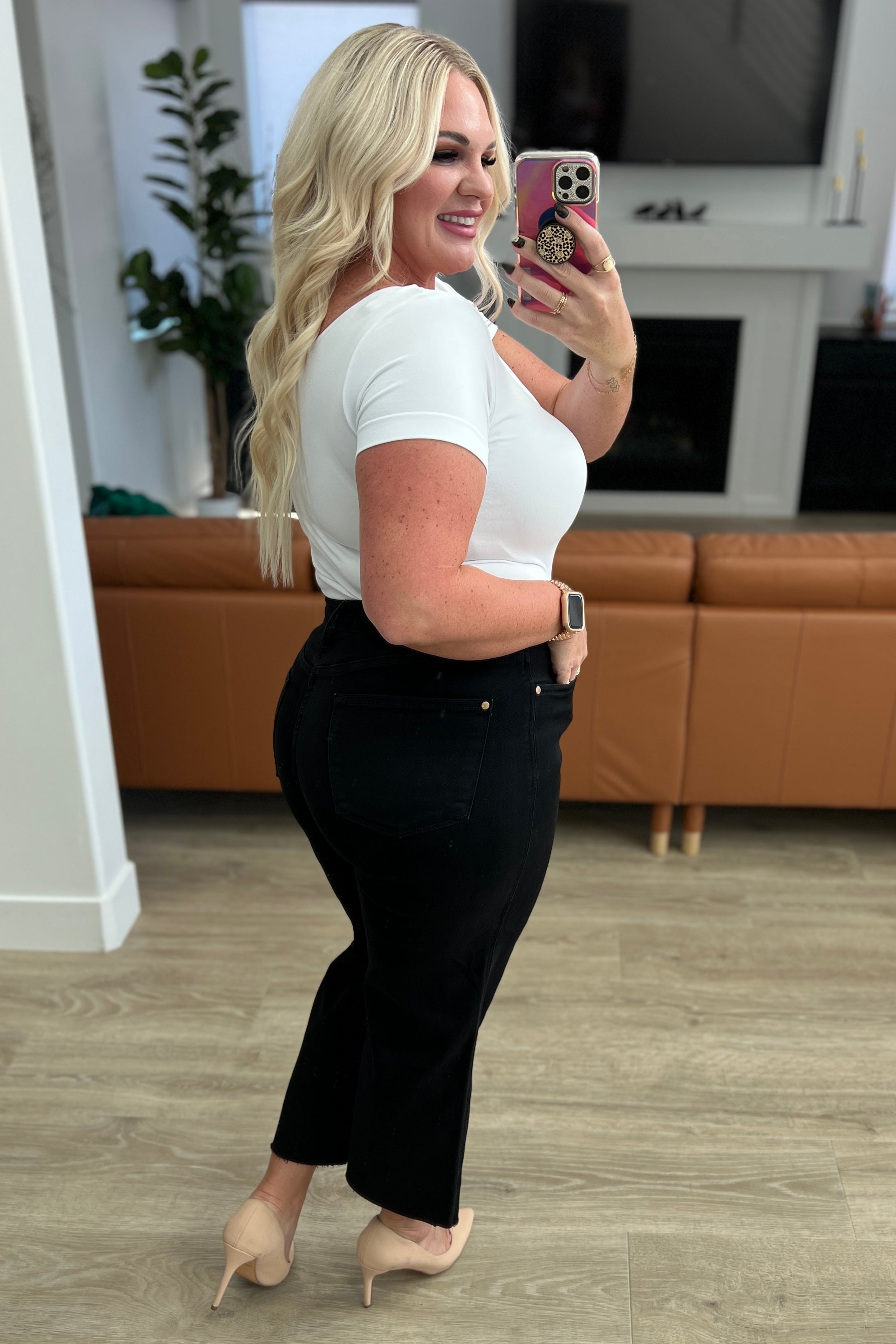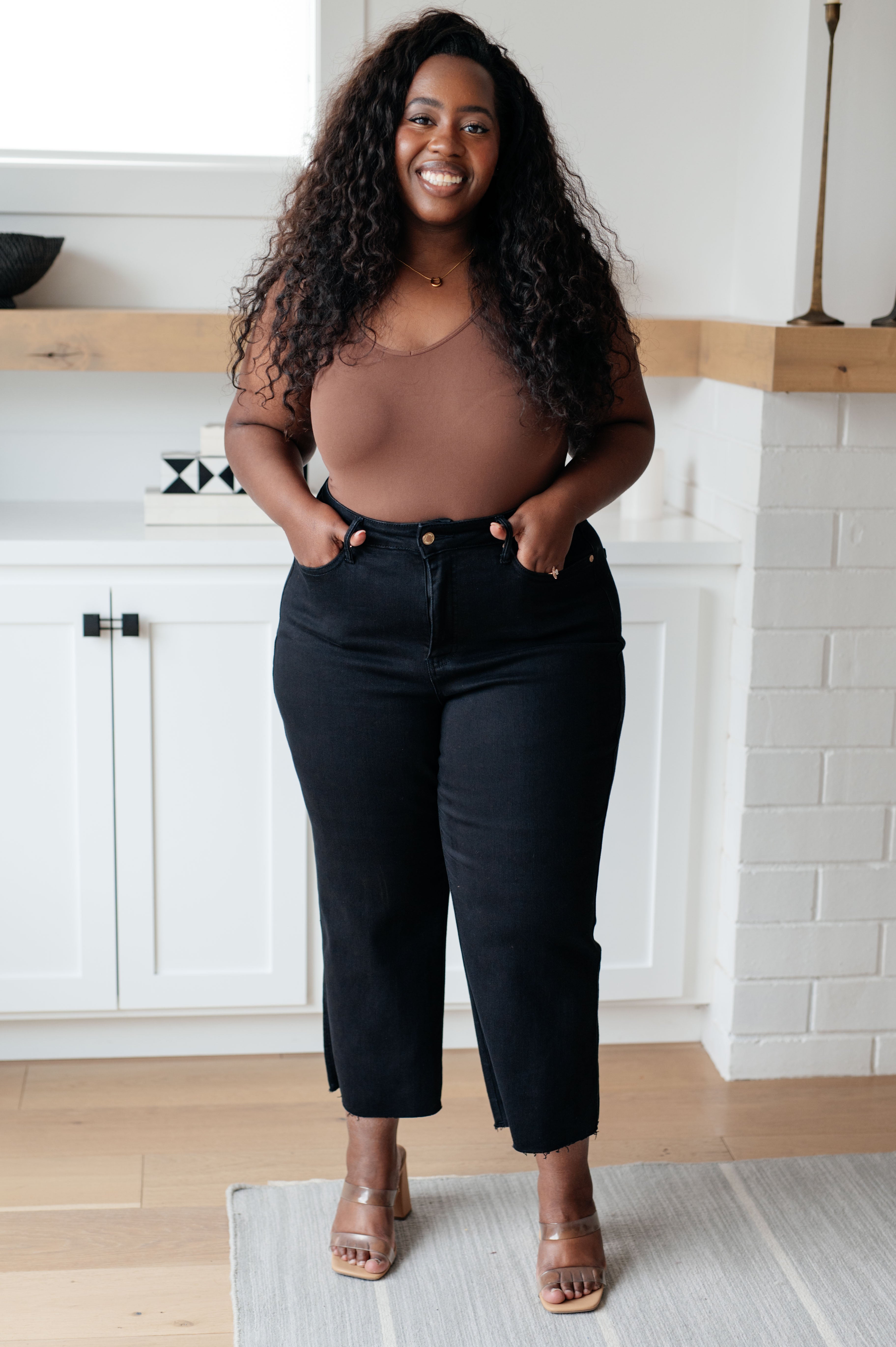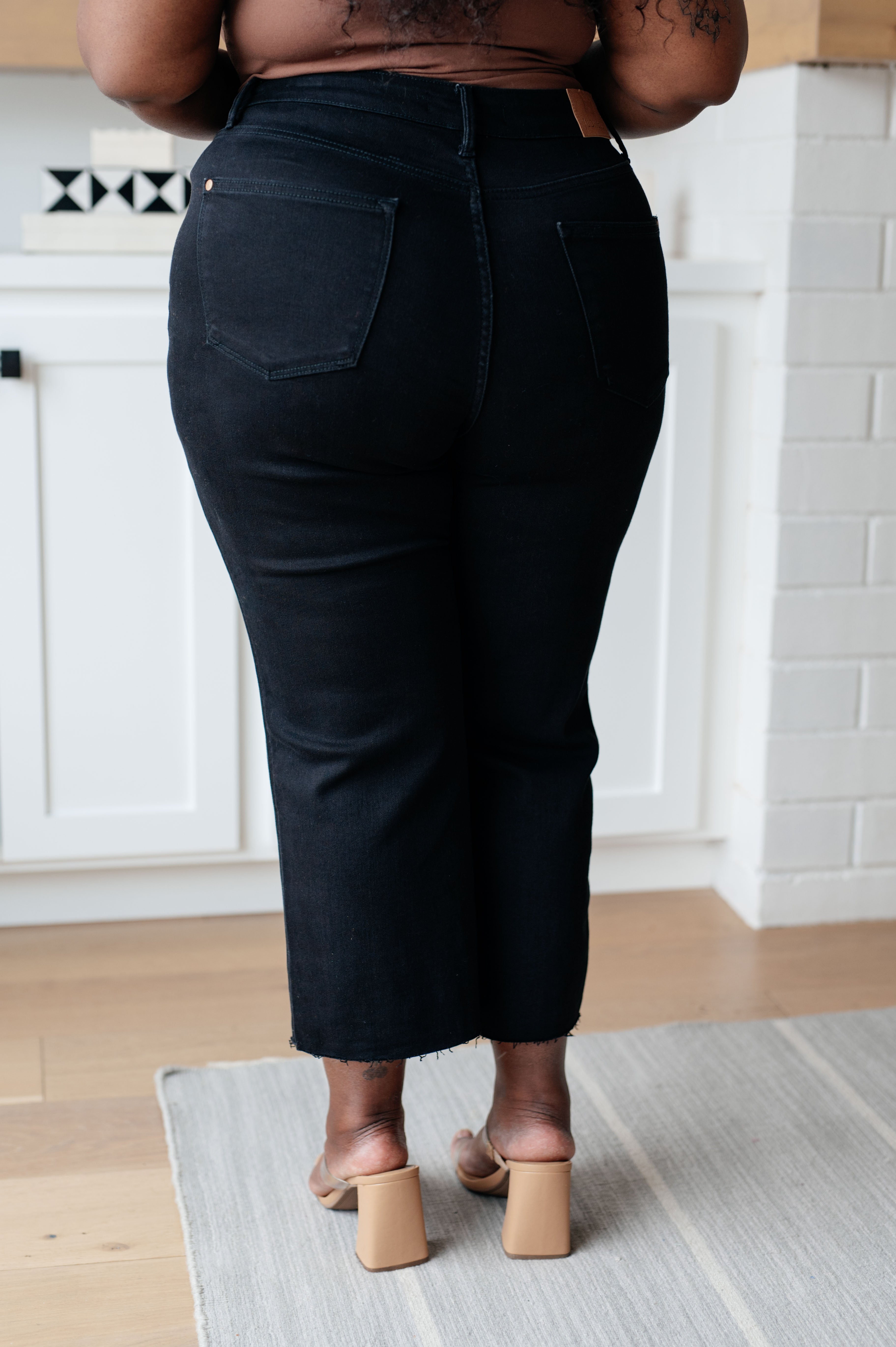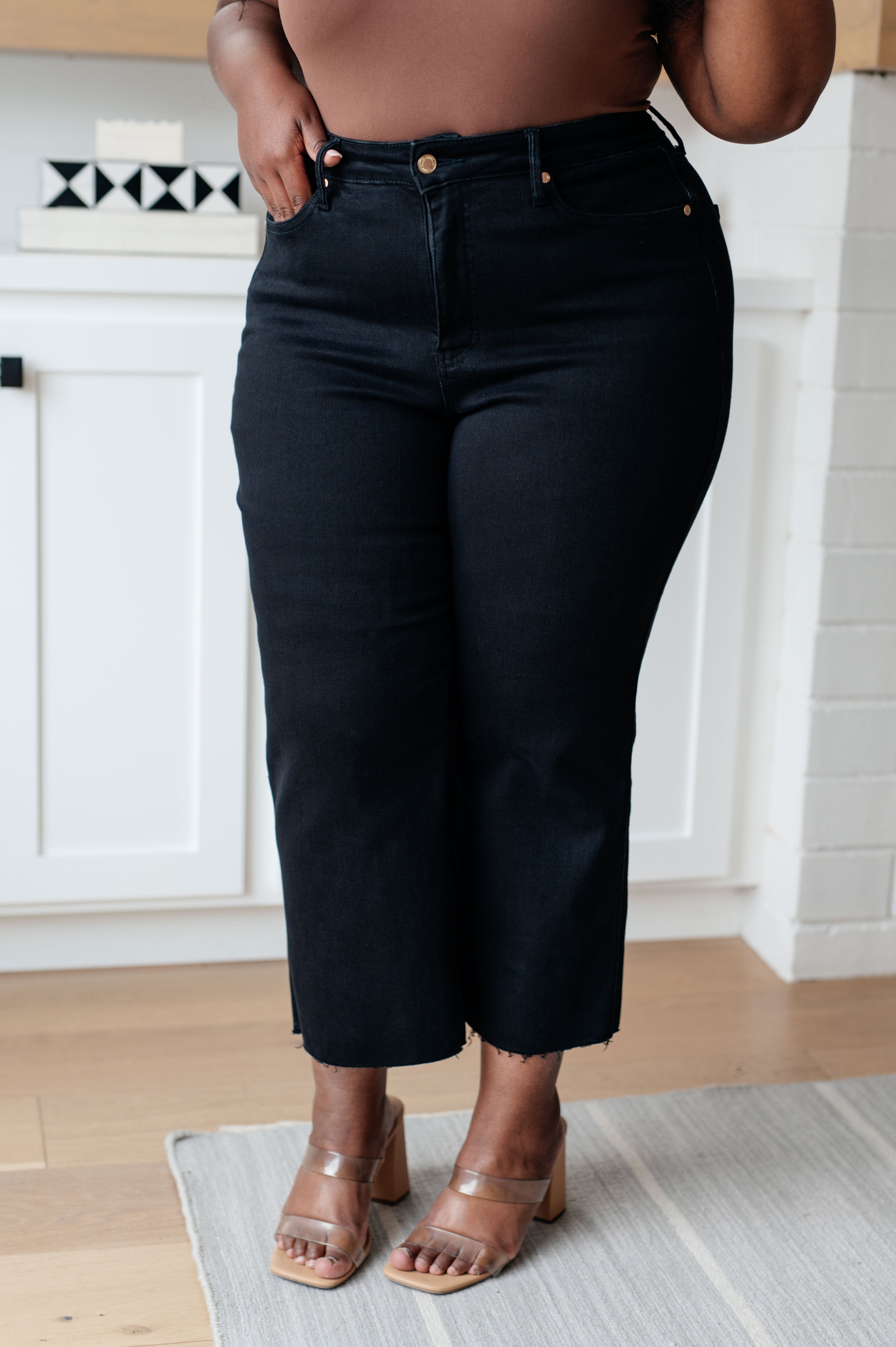 Enjoy a sleek, slimming silhouette with the Lizzy High Rise Control Top Wide Leg Crop Jeans from Judy Blue. This stylish pair features a modern high rise with tummy control technology for a comfortable, flattering fit. The wide leg cut and raw hem add a cool, modern style, while the rich black hue looks great with any top.
