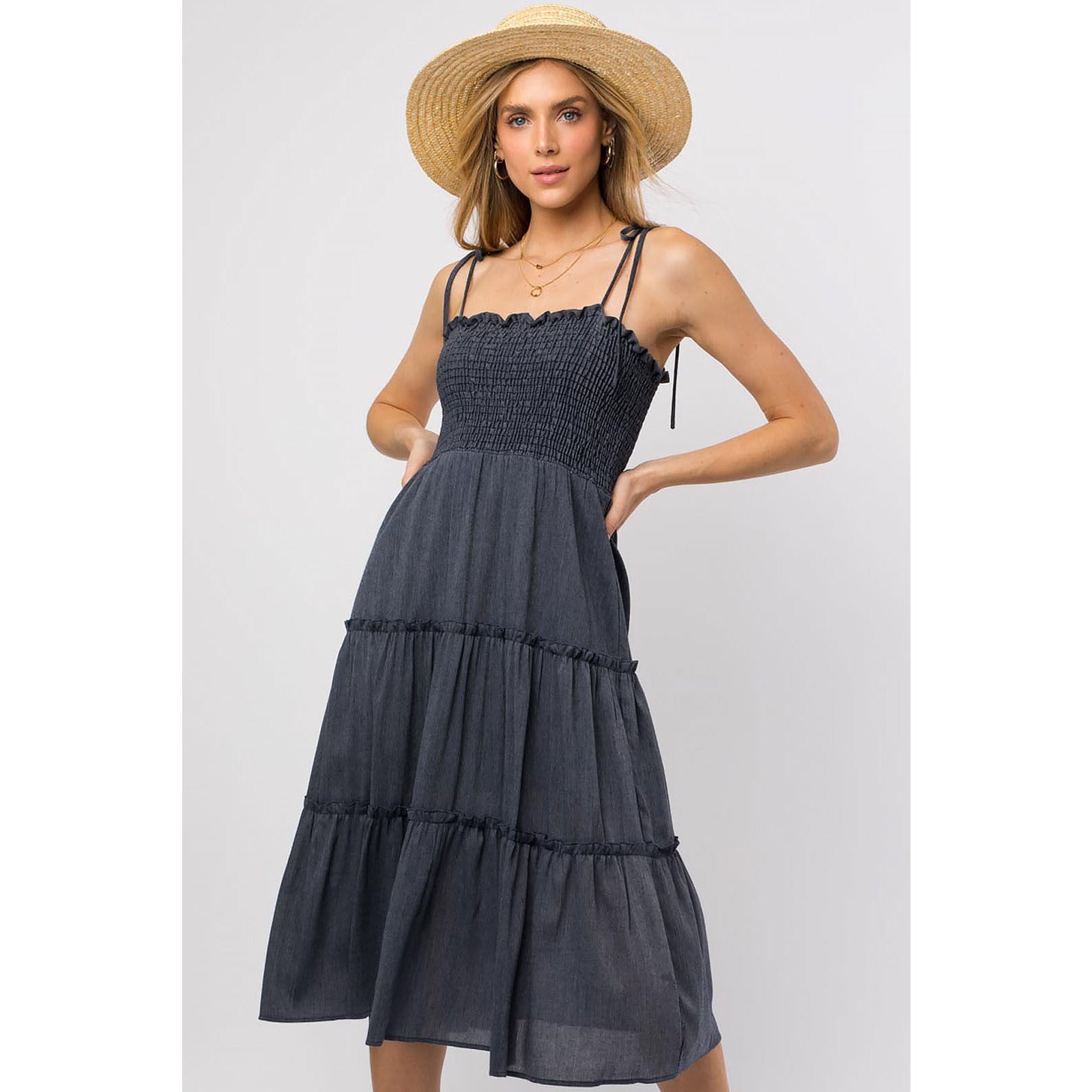 Charcoal sleeveless smocking top tiered midi dress.